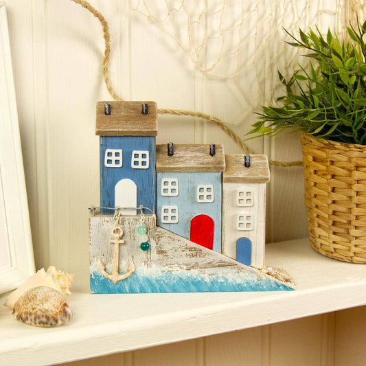 3 Wooden Harbour Cottages Harbourside Houses Driftwood Anchor Nautical Sea Decor